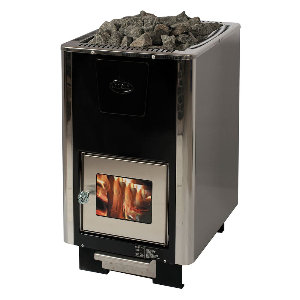 Laadukas kotimainen puulämmitteinen kiuas jossa tuli palaa puhtaasti